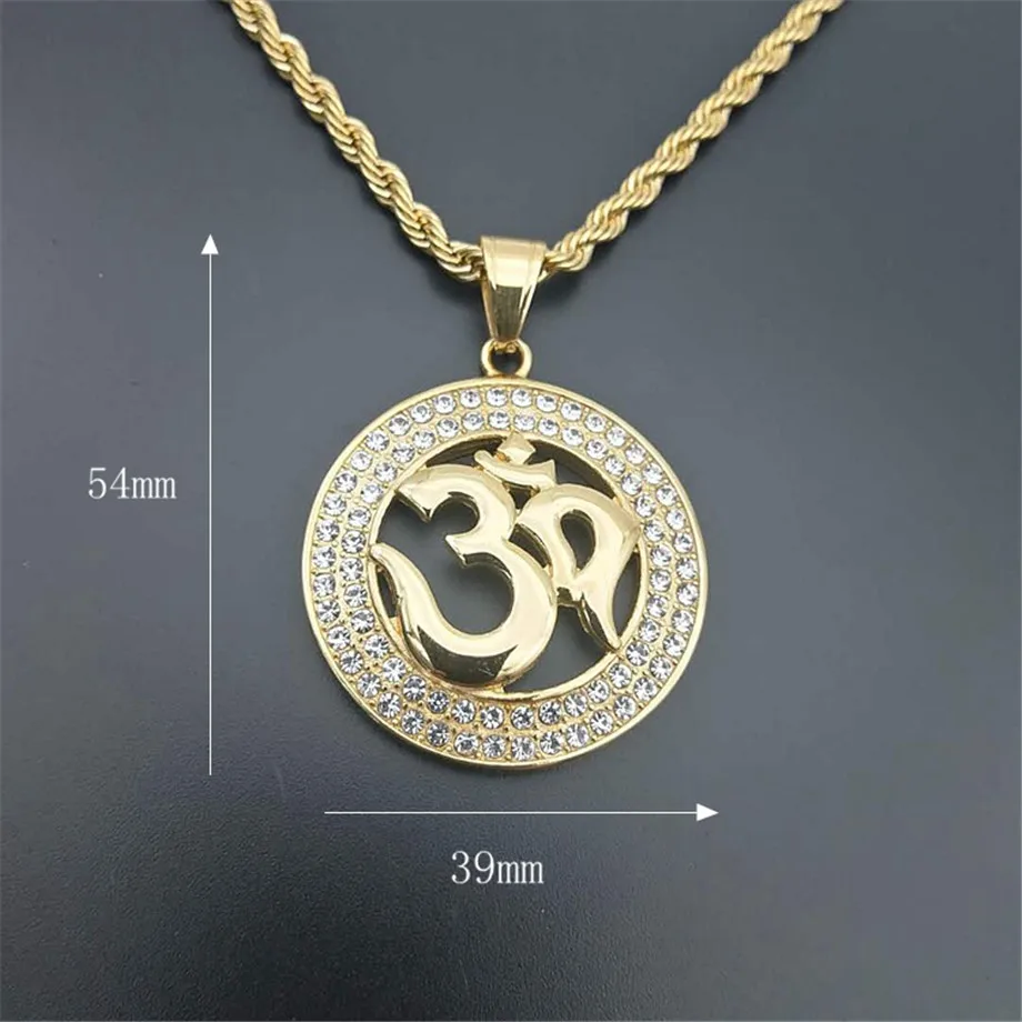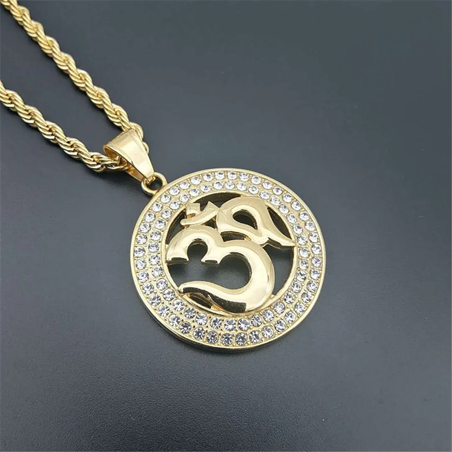 . 安い ヒップホップラウンドインドのペンダントロープチェーンゴールドカラーステンレス鋼オームヒンドゥー教と仏教 AUM OM ネックレスインドジュエリー オンライン 価格.